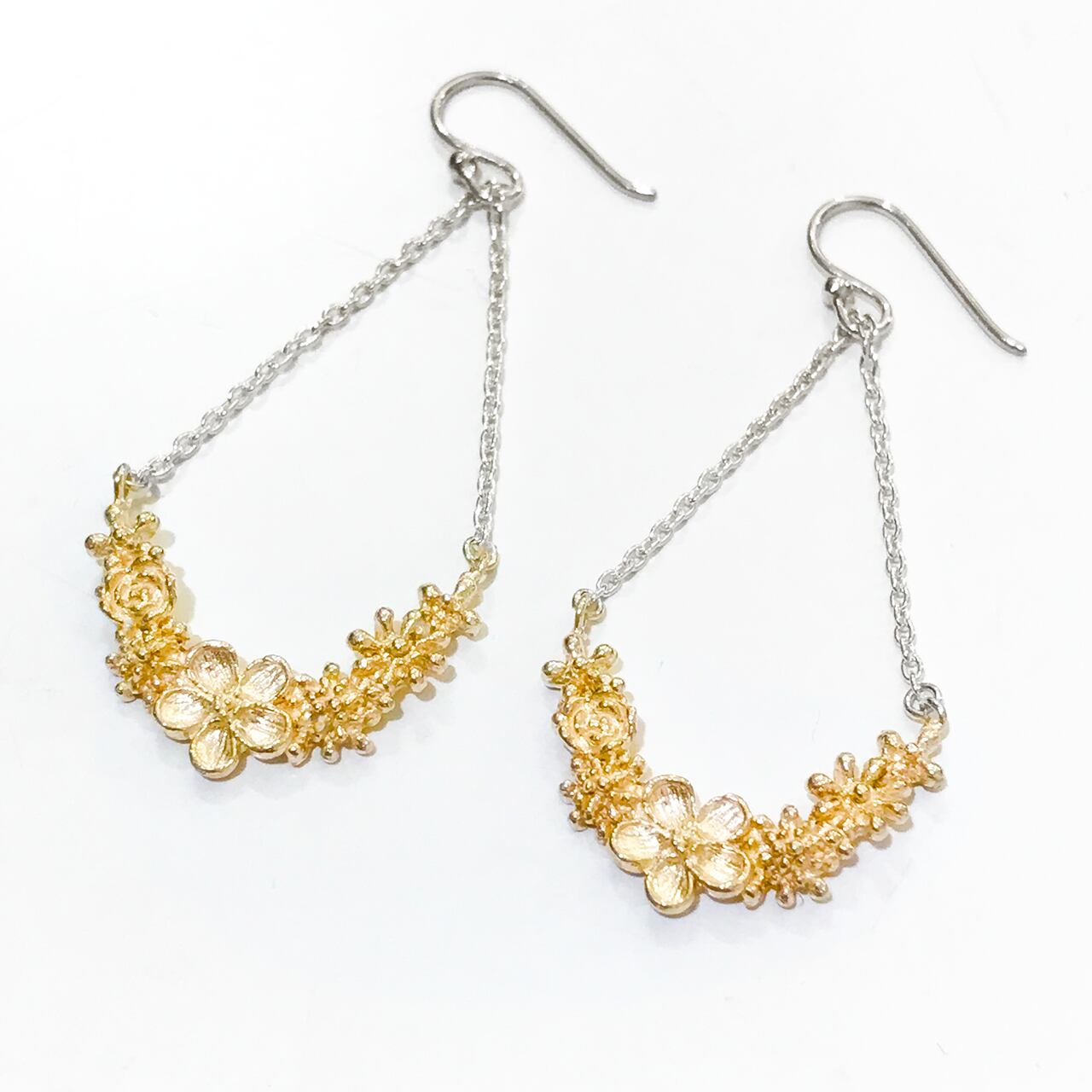 小さな花を集めたデザインの、大きく揺れる楽しいフックピアスです。