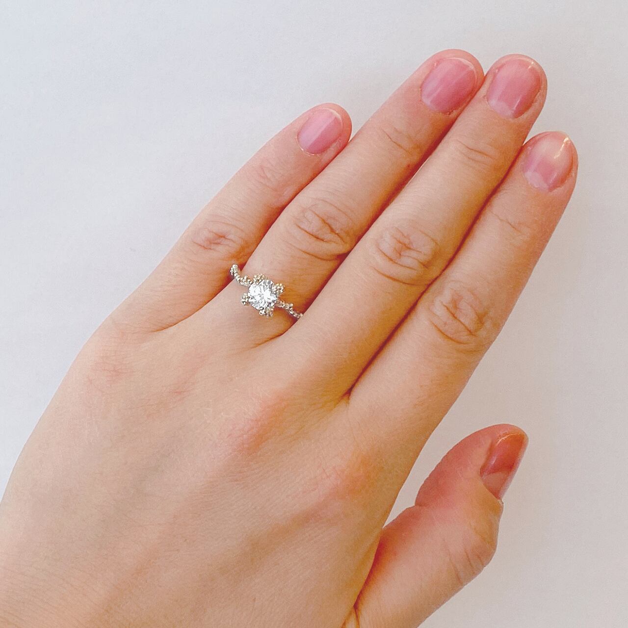 無数の泡が集まって形となり、宝石を支え、美しいジュエリーとなったイメージで制作しました。リングの腕が細めで、重ね付けしやすいデザインです。