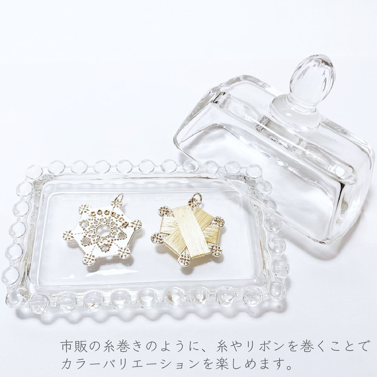 【ご注意】チェーンは別売りです。また、ご購入時は糸は付属しておりません。お客様のご希望に応じてお好みの色の糸を巻いた状態でお送りすることはできますので、メールにてご相談ください。